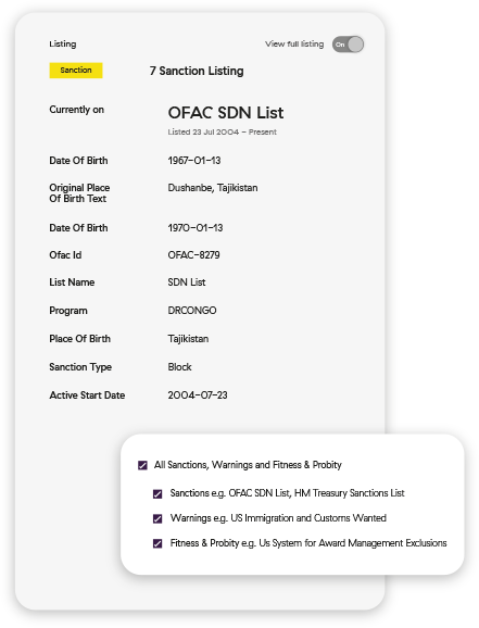 Découvrez comment plus de 1000 entreprises de premier plan procèdent à un filtrage par rapport à la seule base de données de risques en temps réel au monde qui répertorie les personnes et les entreprises.