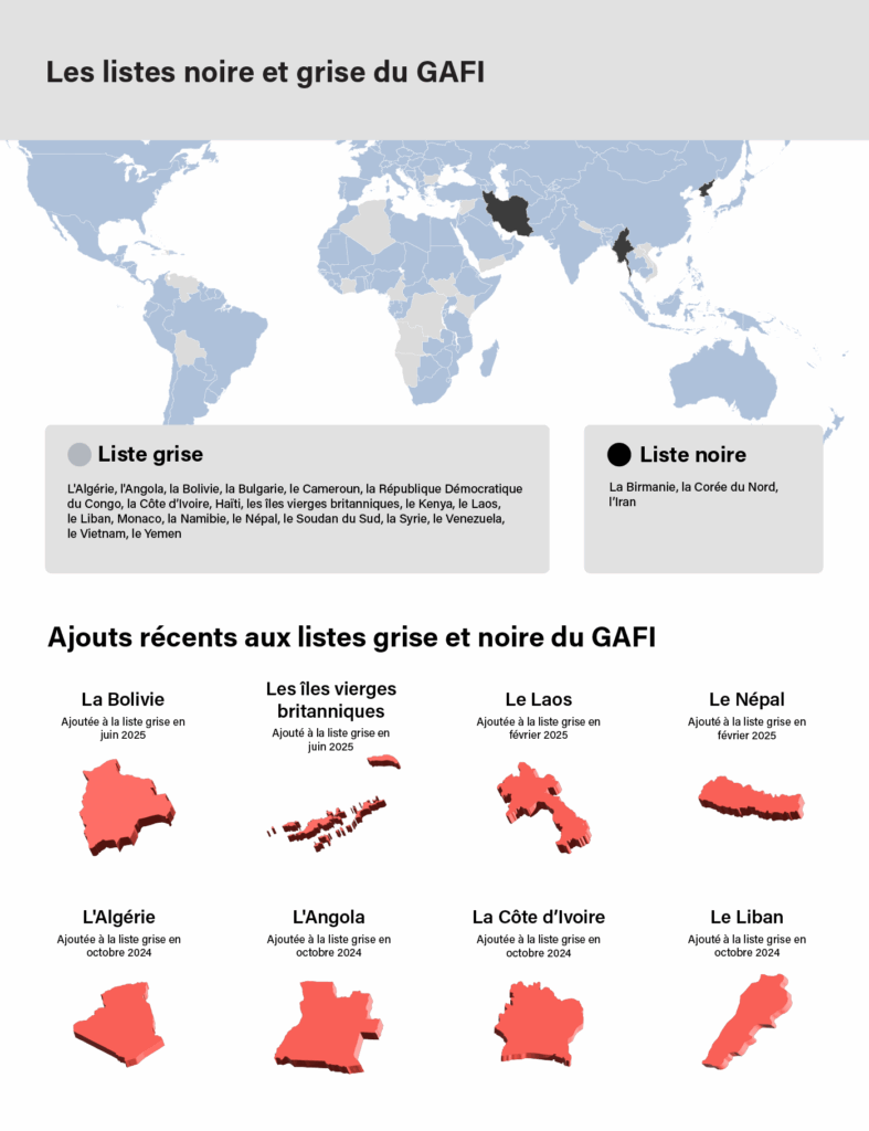 Le Groupe d’action financière (GAFI) est un organisme intergouvernemental qui supervise les tendances mondiales en matière de blanchiment d’argent et de financement du terrorisme. Il collabore avec ses États membres et les organisations régionales pour élaborer un cadre juridique, réglementaire et opérationnel permettant de lutter contre ces menaces. Dans le cadre de ses efforts, le GAFI gère une liste noire, officiellement connue sous le nom de juridictions à haut risque faisant l’objet d’un appel à l’action, et une liste grise. La liste grise intègre les pays qui se sont engagés à résoudre les lacunes stratégiques de leur politique en matière de blanchiment d’argent et de financement du terrorisme (LCB-FT). Compte tenu du risque réglementaire potentiel en lien avec les pays qui ne respectent pas les normes internationales de conformité, les établissements financiers doivent connaître les pays figurant sur les listes noires et grises du GAFI et savoir ce qu’implique cette désignation.