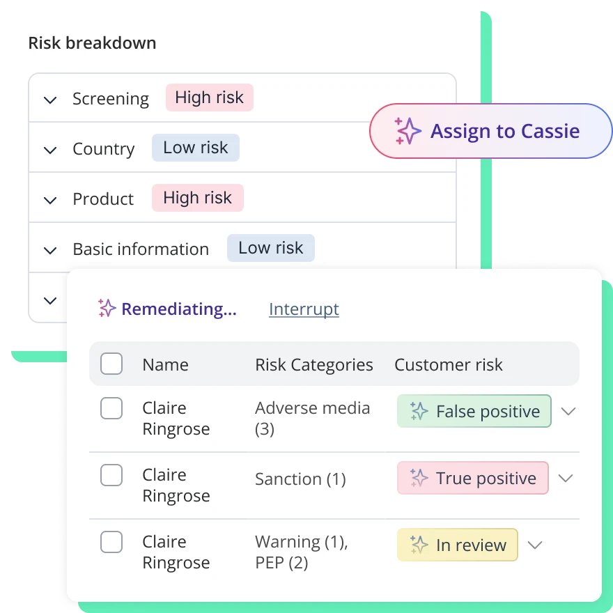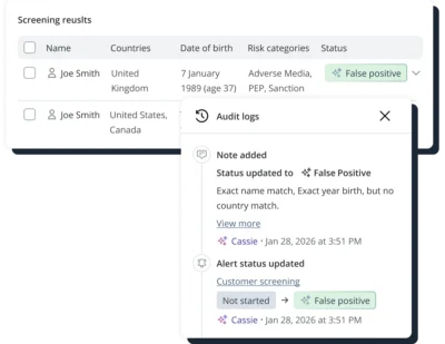 - Remove onboarding bottlenecks by auto-remediating level 1 alerts against sanctions, PEPs, and adverse media.