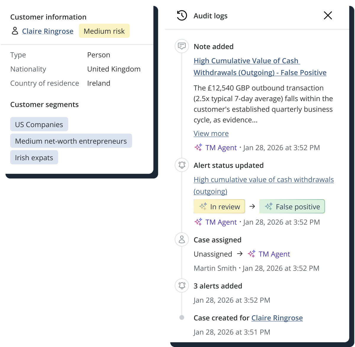 - Generate instant audit trails: Ensure every investigation is regulator-ready with a system that automatically logs every action, data point, and decision in a transparent, chronological record.