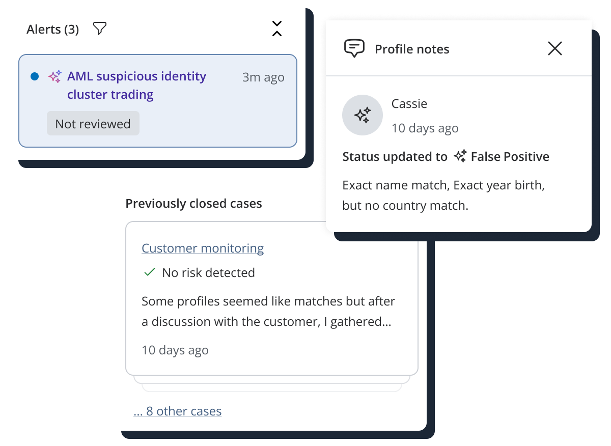 - Extract immediate AML insights: Move beyond simple flags with an AI-native workspace that synthesizes complex risk profiles and transaction patterns into clear, actionable summaries for your team.